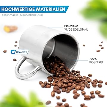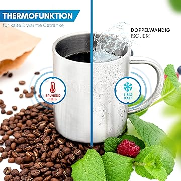 - 🌿 𝗗𝗢𝗣𝗣𝗘𝗟𝗪𝗔𝗡𝗗𝗜𝗚 𝗜𝗦𝗢𝗟𝗜𝗘𝗥𝗧 – Dank der doppelwandigen Isolierung der Edelstahl Tassen hält sich die Trinktemperatur länger stabil und sorgt dadurch für einen erstklassigen Trinkgenuss.